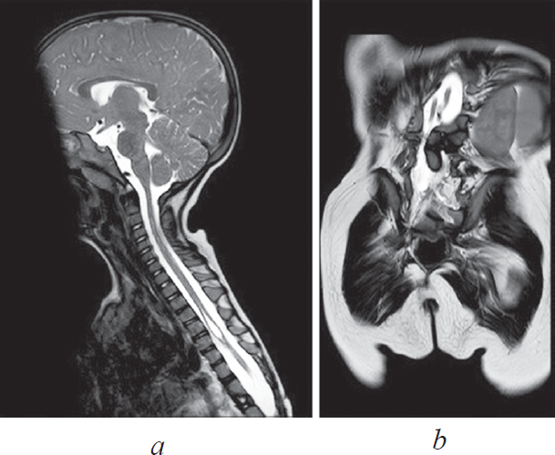 Рис. 2. Предоперационная магнитно-резонансная томография: a — гидромиелическая киста на уровне Th5-Th6; b — расщепление спинного мозга на два гемикорда ниже уровня Th7