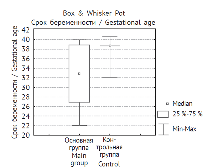 Рис. 1. Срок беременности на момент родоразрешения у пациенток основной и контрольной групп