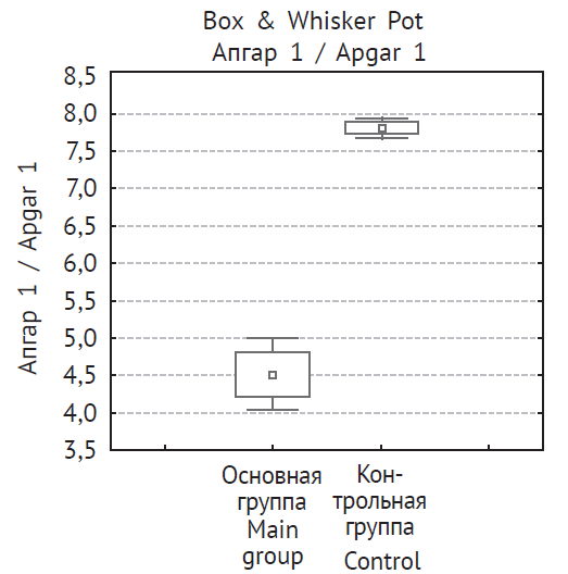 - Оценка по шкале Апгар на 1-й и 5-й минутах жизни у детей основной группы значимо ниже, чем в контрольной.