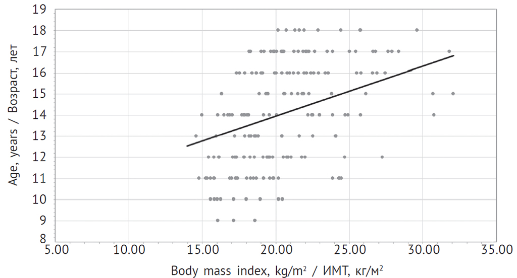 Materials and methods. The work was attended by students of St. Petersburg schools (children and adolescents) and patients (adults) who are being treated in St. Petersburg State Medical Institution “Elizavetinskaya Hospital”. The sample was random: when collecting data from children and adolescents, data from one of the classes in each parallel from 4th to 11th grade were taken into account, when collecting data from adults – 2 people from each ward of the gastroenterology department of the St. Petersburg State Medical Institution “Elizavetinskaya Hospital”. Data collection was carried out in the period: August–December 2020. Statistical processing was performed out using the computer software package SPSS 8.0. Estimation of anthropometric parameters (age, body weight, height) and calculation of body mass index (BMI) were performed in 74 children (age 9–12 years), 137 adolescents (age 13–18 years) and 55 adults (mean age 49.12 ± 17.03).