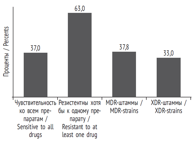 Среди стафилококков был выявлен высокий процент полирезистентных культур (MDR — multidrug-resistant) и штаммов с экстремальным фенотипом резистентности (XDR — extensively drug-resistant). Так, удельный вес MDR стафилококков составил 37,8 %, а на долю штаммов XDR пришлось 33,0 % (рис. 1).