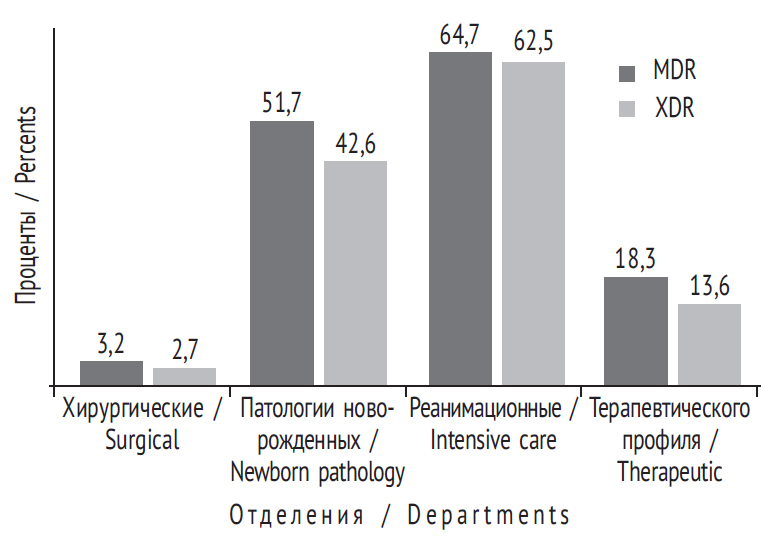 Интересным представляется распределение культур MDR и XDR в различных отделениях многопрофильного детского стационара (рис. 2). Максимальный удельный вес таких штаммов выявлен в отделениях, в которых находятся наиболее ослабленные дети. Так, в реанимационных отделениях он составил 64,7 и 62,5 % соответственно, несколько ниже — в отделениях патологии новорожденных (51,7 и 42,6 %). В три раза ниже была доля MDR- и XDR-изолятов в терапевтических отделениях (18,3 и 13,6 %) и самой низкой (3,2 и 2,7 %) — в хирургических.