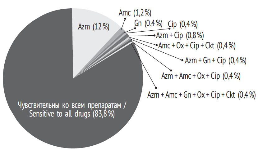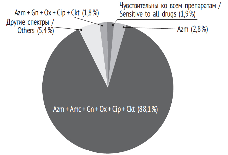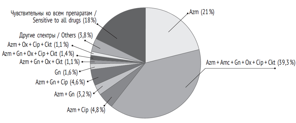 Наборы детерминант резистентности S. epidermidis были разнообразны, у них было выявлено 19 вариантов спектров антибиотикорезистентности, при этом преобладали комбинация Azm + Аmc + Gn + Ox + Cip + Ckt (39,3 % штаммов) и спектр моноустойчивости к одному Azm (21,0 %). Значительно реже встречались другие фенотипы резистентности, так, спектр Azm + Cip составил 4,8 %, Azm + Gn + Cip — 4,6 %, Azm + Gn — 3,2 % (рис. 3). Остальные спектры были представлены единичными штаммами.