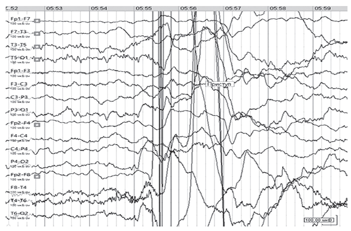 Рис. 1. Иктальная электроэнцефалограмма ребенка в возрасте 3 мес. Регистрируется миографический артефакт. Эпилептических изменений нет