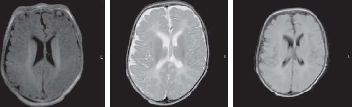 Fig. 2. Magnetic resonance imaging of a patient at the age of 3 months. Axial sections, T1 VI, T2 VI, Flair. The signs of delayed myelination, were found to be symmetrical at the level of the perirolandic region. The architectonics of the furrows and convolutions have not been changed