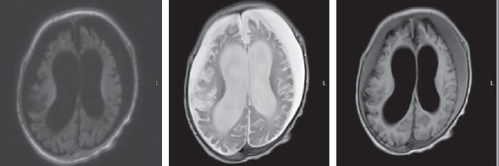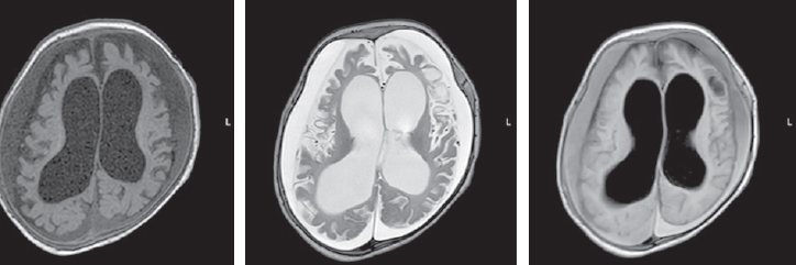 Рис. 3. Магнитно-резонансная томограмма пациента в возрасте 4 мес. Аксиальные срезы, Т1ВИ, Т2 ВИ, Flair. Наблюдается отрицательная динамика в виде кистозно-атрофических изменений в больших полушариях головного мозга с формированием атрофической гидроцефалии. Появление симметричных подоболочечных скоплений в виде субдуральных гигром