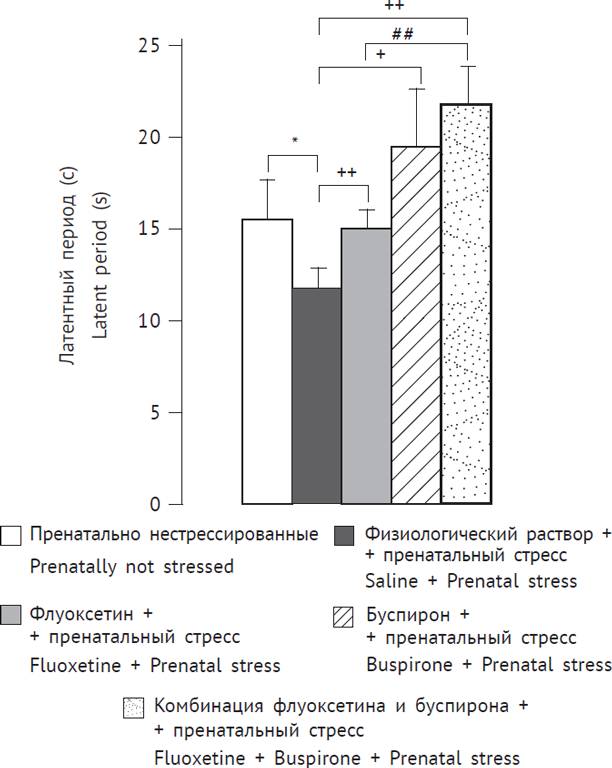 Рис. 1. Влияние инъекций флуоксетина, буспирона и комбинации этих препаратов самкам крыс во время беременности на латентный период в тесте горячей пластины у женского потомства в препубертатный период развития: *p < 0,05 — между пренатально стрессированными с введением физиологического раствора и пренатально не стрессированными; +p < 0,05, ++p < 0,01 — между пренатально стрессированными с введением препаратов и пренатально стрессированными с введением физиологического раствора; ##p < 0,01 — между флуоксетин + пренатальный стресс и комбинацией флуоксетина и буспирона + пренатальный стресс