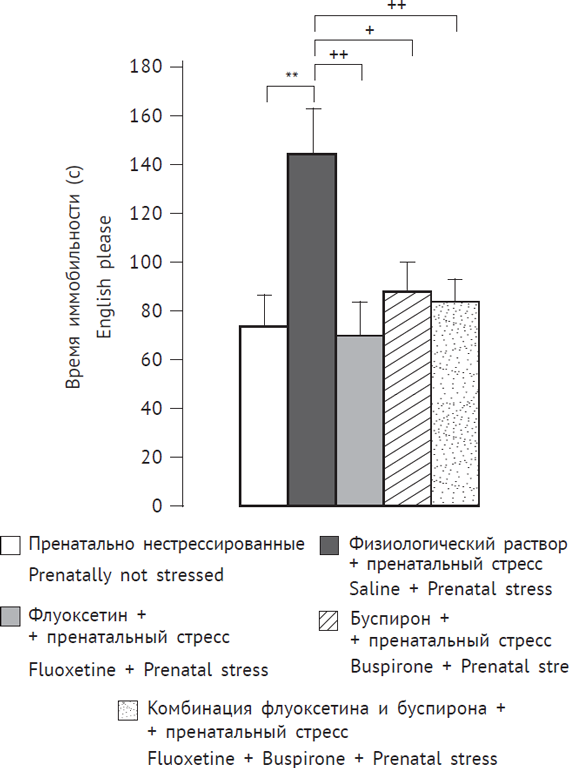 Рис. 3. Влияние инъекций флуоксетина, буспирона и комбинации этих препаратов самкам крыс во время беременности на время иммобильности в тесте принудительного плавания у женского потомства в препубертатный период развития: **p < 0,01 — между пренатально стрессированными с введением физиологического раствора и пренатально не стрессированными; +p < 0,05, ++p < 0,01 — между пренатально стрессированными с введением препаратов и пренатально стрессированными с введением физиологического раствора